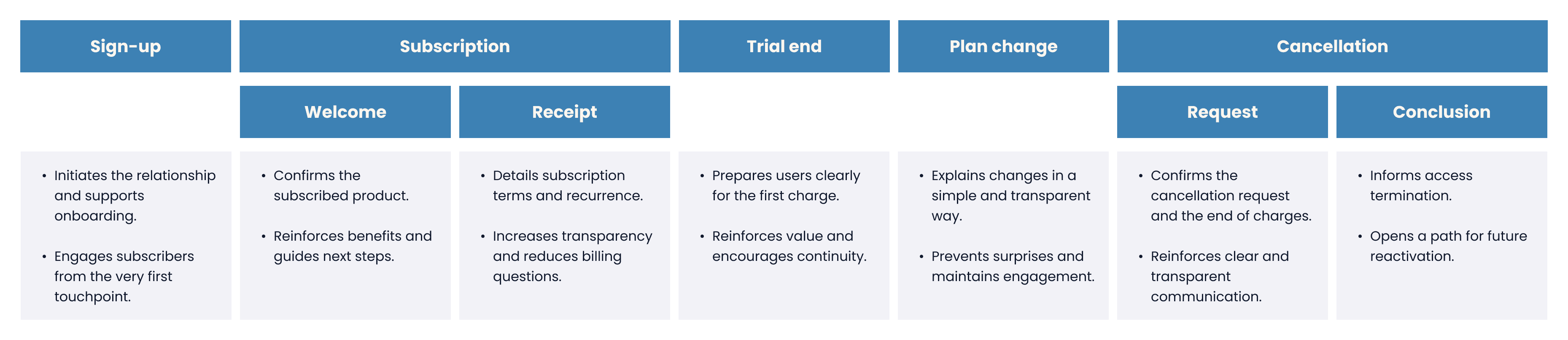 The decision was to design a structured communication lifecycle aligned with key moments of the subscription journey — from sign-up and onboarding to billing, plan changes, and cancellation — focused on clarity, expectation-setting, and consistency.